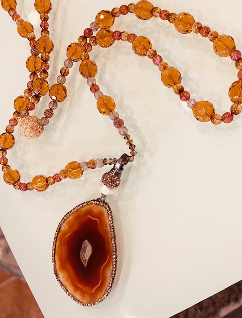 Custom-made for Papillon Studio by premiere New York designers. Genuine encrusted Abalone pendant necklace. Pendant is detachable adorned with silver druzzi and fresh water single pearl. Necklaced is 16′ long.