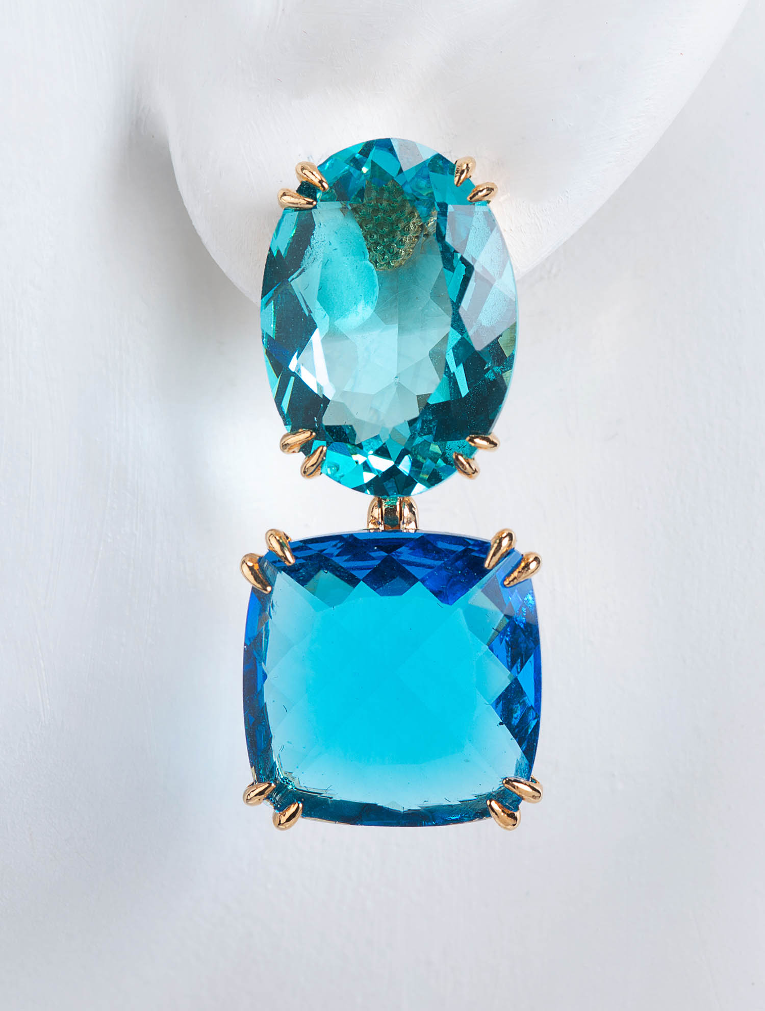 Blue topaz, two-stone earrings in 18 K yellow gold-plated setting. Post.