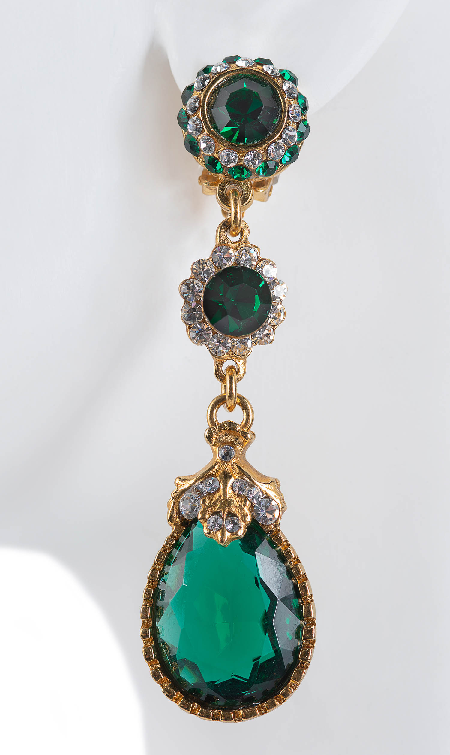 Green color quartz chandelier earrings finished in 22 K gold-plated. Cushioned clip. 3′ long “Zarina” style.