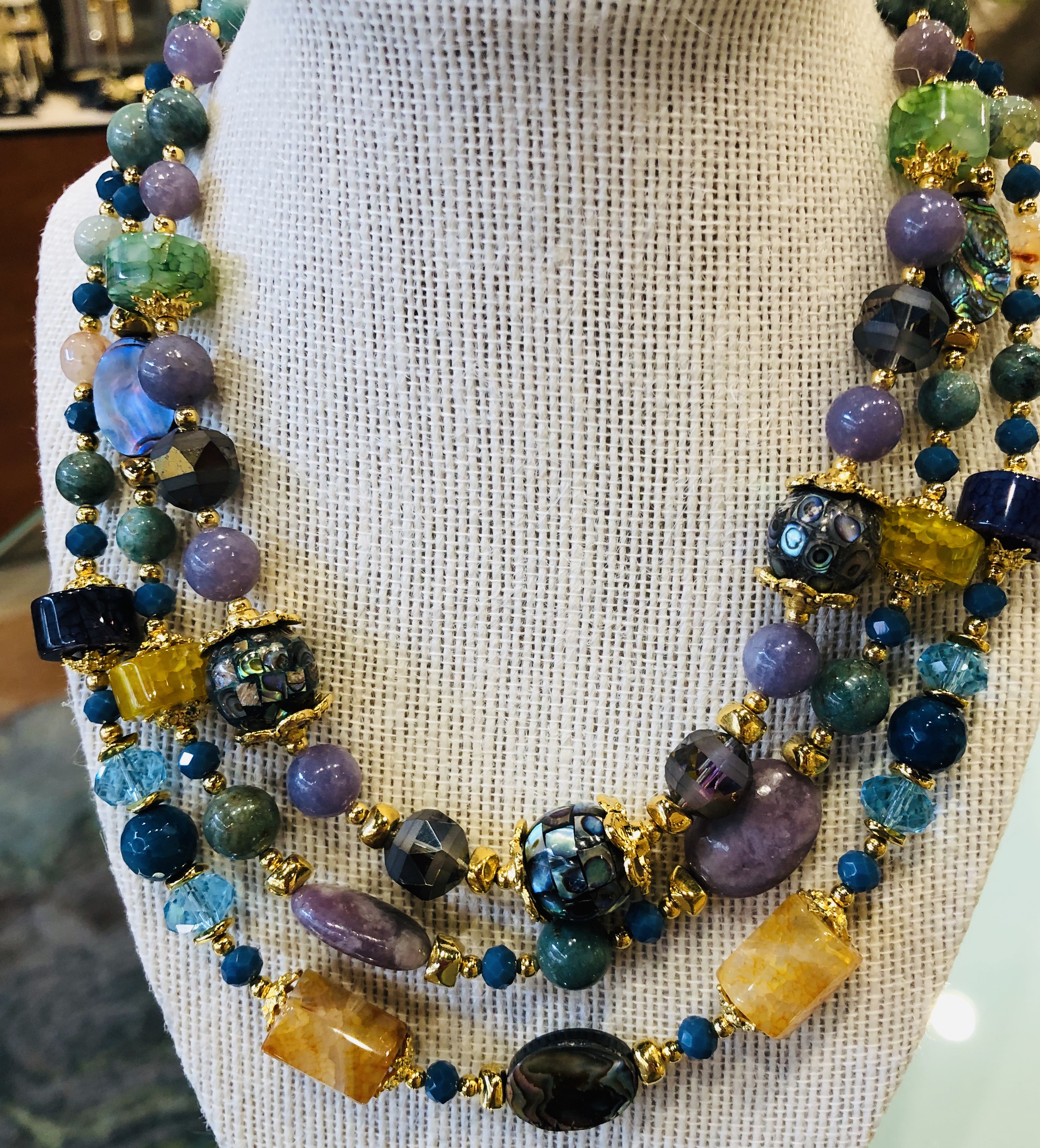 Multi-gem, 3-strand Abalone, Amber and other rare beads finished in 24 K gold-plated details and clasp. Stunning! Great for all seasons and climates. Rare quality beads and super workmanship. Flexible 4-payment plan through Klarna is available. Quick approval. Quality and service guaranteed. Return policy — store credit for one year.
