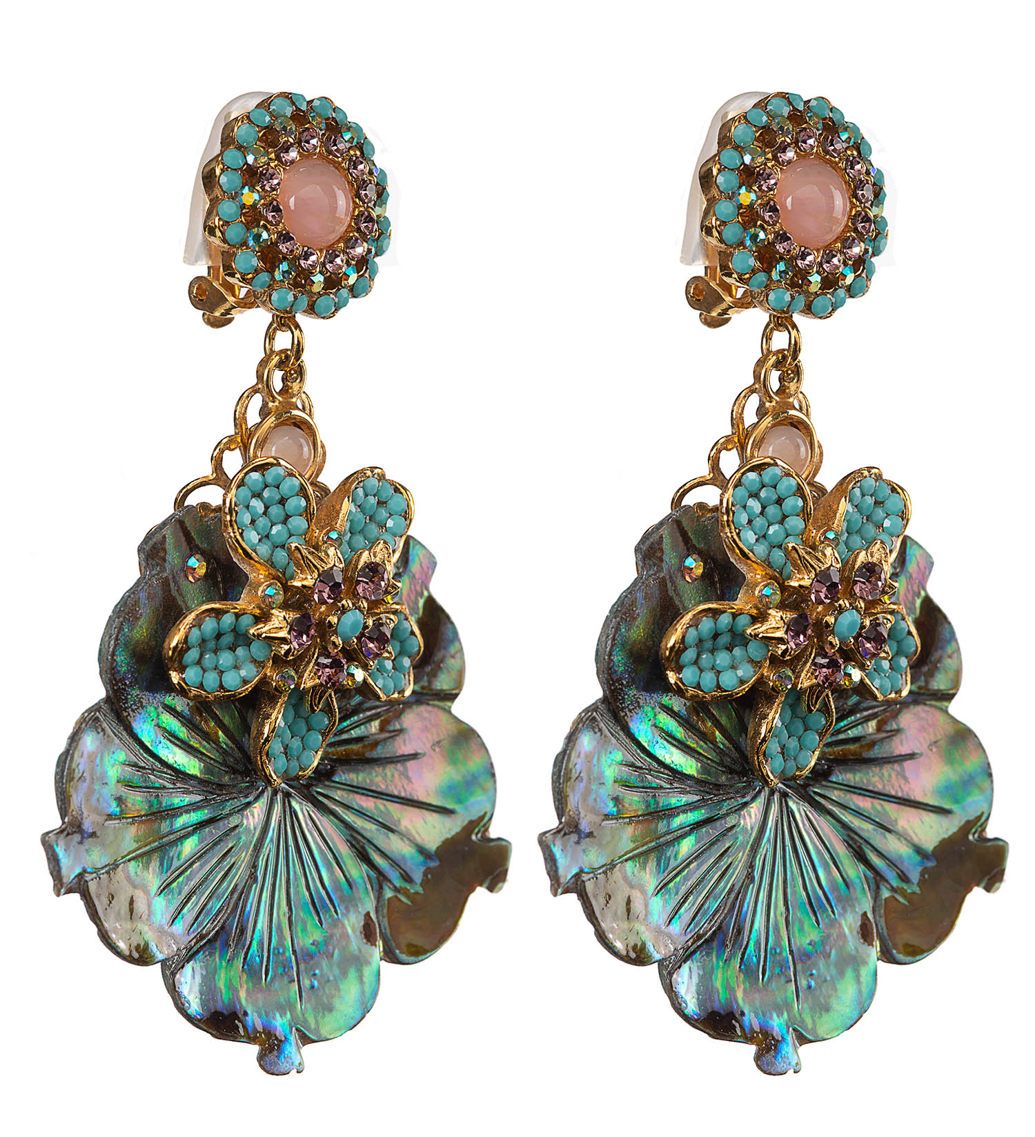 Pink opal, turquoise, and black mother-of-pearl earrings