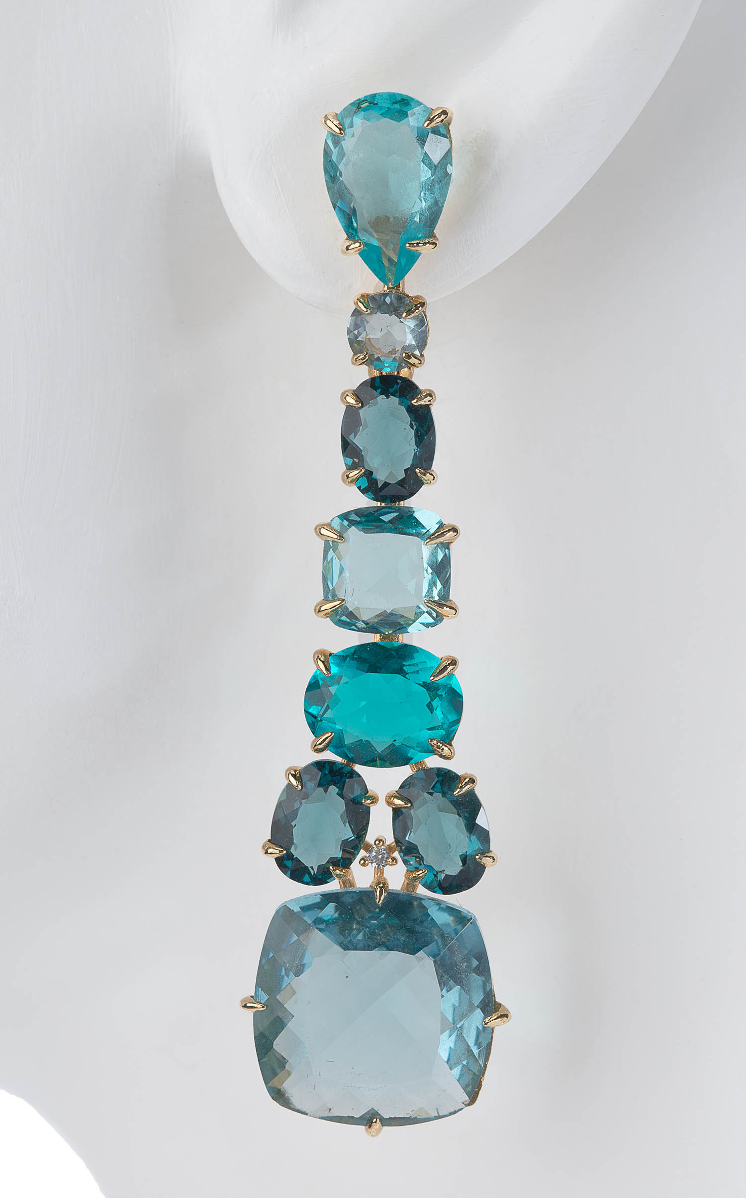 Rapsody in blue – aquamarine, London blue topaz, green rare Amethyst in chandelier-style long earrings.
