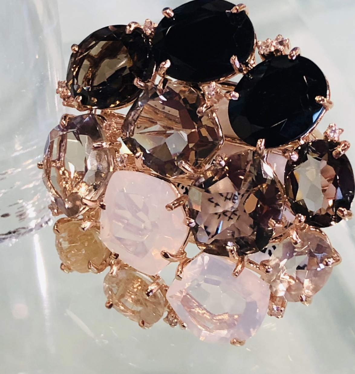 Spectacular multi-gem ring, including black onyx, citrine, moon stone, smoky quartz, amethyst, opal finished in plated rose gold. Size: 7.5-8. Diameter of the ring 1.6x 1.6 round. Over 29 carats in gem stones. Certified. Made in Brazil by famous gem-stone jewelry producer.