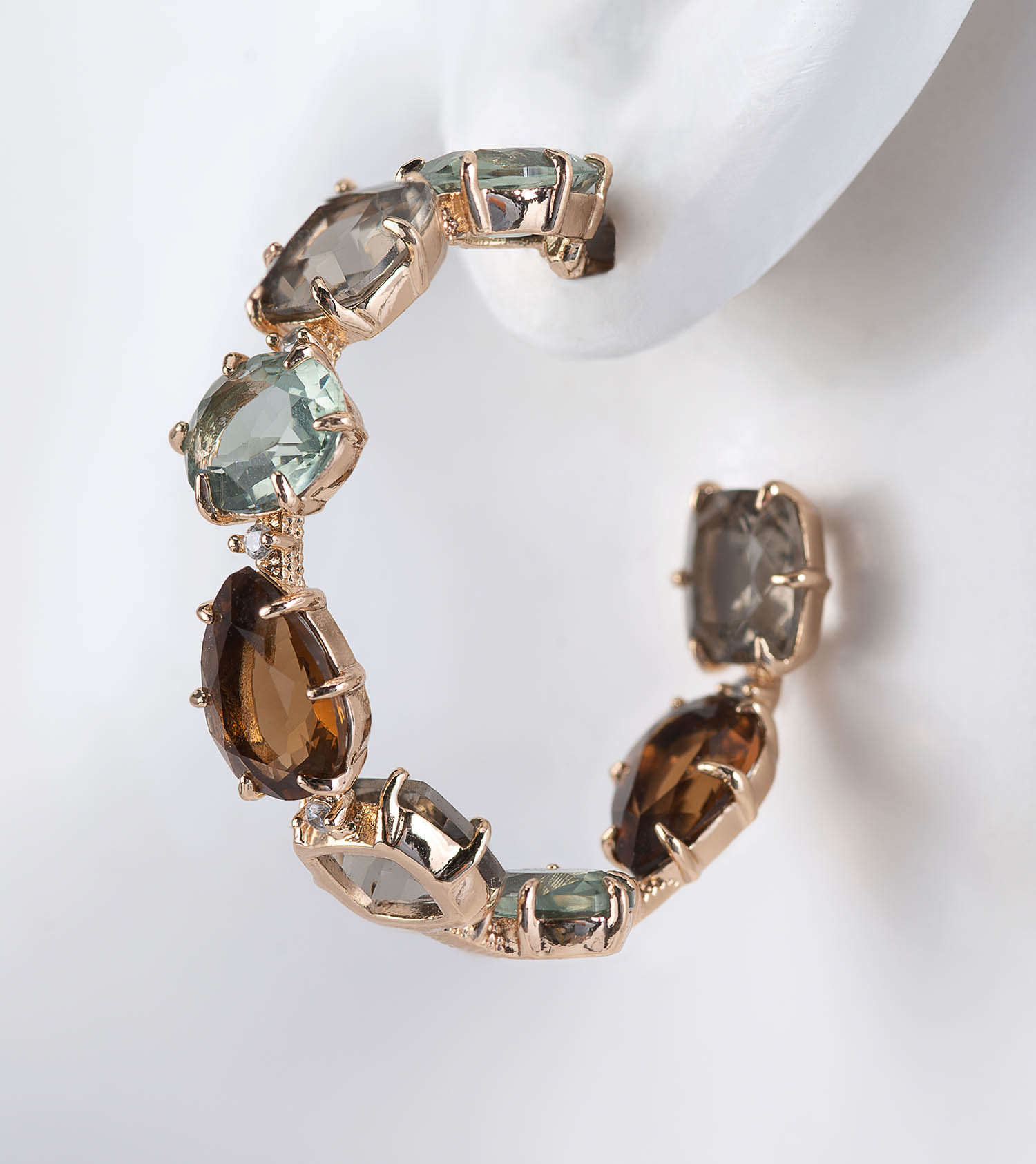 Multicolored gem hoop earrings set in 18 K yellow gold-plated finish. Will not tarnish. Post. Available also in yellow-green tones (Smokey quartz, citrine, amethyst) or pink clear tourmaline, or blue topaz.